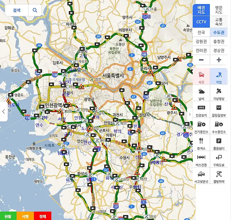 ▶ 사이트로 접속 후 왼쪽 메뉴에서 사고, 정체, 작업 관련 내용을 선택할 수 있습니다. 오른쪽에는 CCTV, 우회도로, 휴게소, 졸음쉼터 등을 표시하기 위한 옵션이 있습니다.