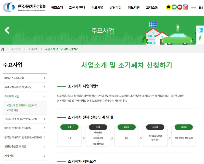 조기폐차 지원 사업은 노후자동차에서 발생하는 매연을 줄여 쾌적한 대기환경을 조성하기 위해 정상운행이 가능한 경유자동차를 조기에 폐차할 경우 보조금을 지원해 주는 사업입니다.